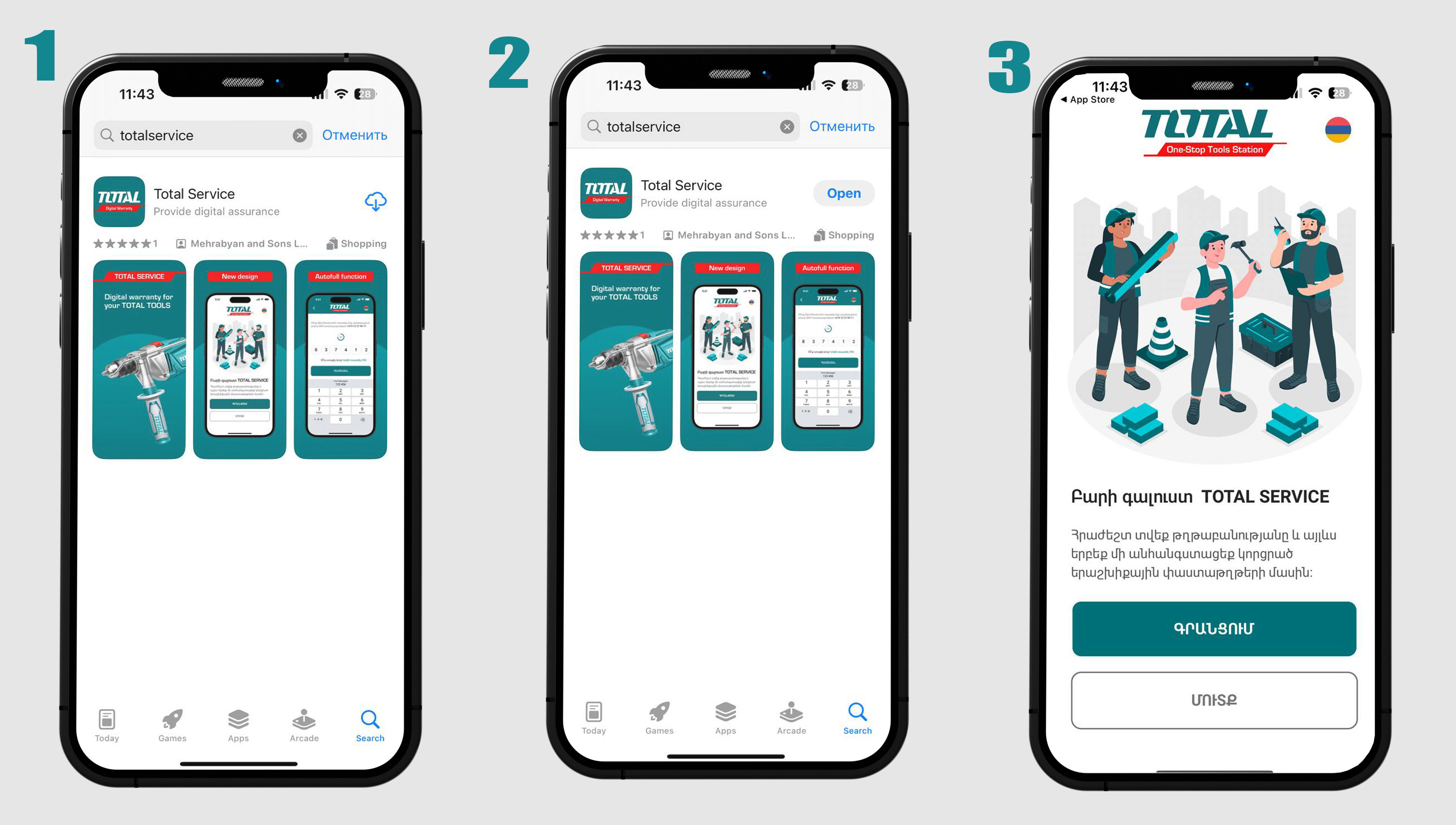 Ձեր հեռախոսից մուտք գործեք App store կամ Play Market, որոնման հատվածում գրեք՝ totalservice, սեղմեք ներբեռնել կոճակին և վերջ։